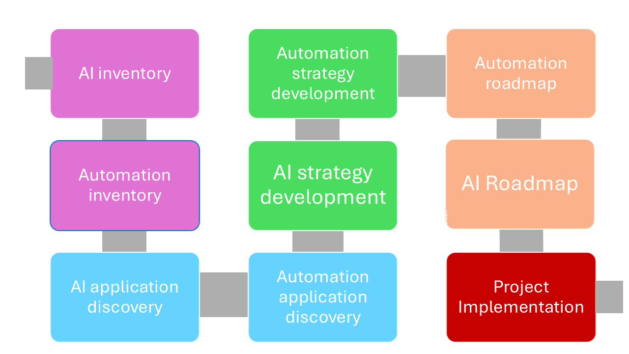 We begin by assessing your existing use of AI and automation, if any. From there, we identify the technologies best suited to your specific business needs. Based on this insight, we develop tailored AI and automation strategies, roadmaps, and implementation plans.